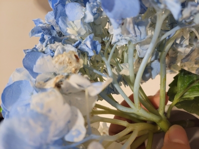 남편에게 생일선물받았어요 블루에 비해 화이트 꽃상태가 부분부분 좋지않았지만, 워낙 블루를 좋아한터라..그런데 이거 뭡니까? 블루수국 줄기도 블루네요 본디 이렇게 물감 뿌려서 만드는건가요?
