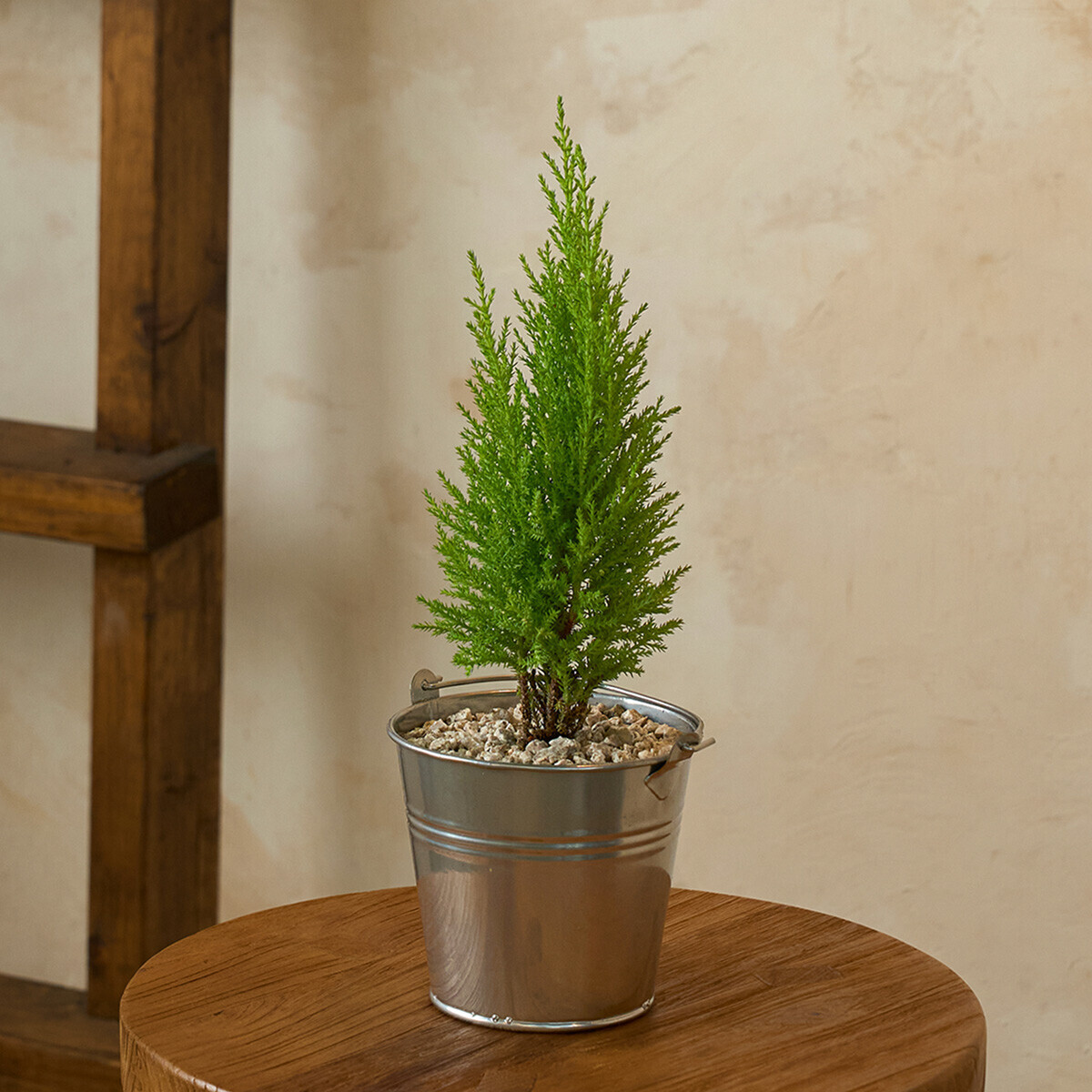 솔잎 향 가득한 초록 식물, 감성적인 양철 화분과 함께 산뜻함을 더해줘요