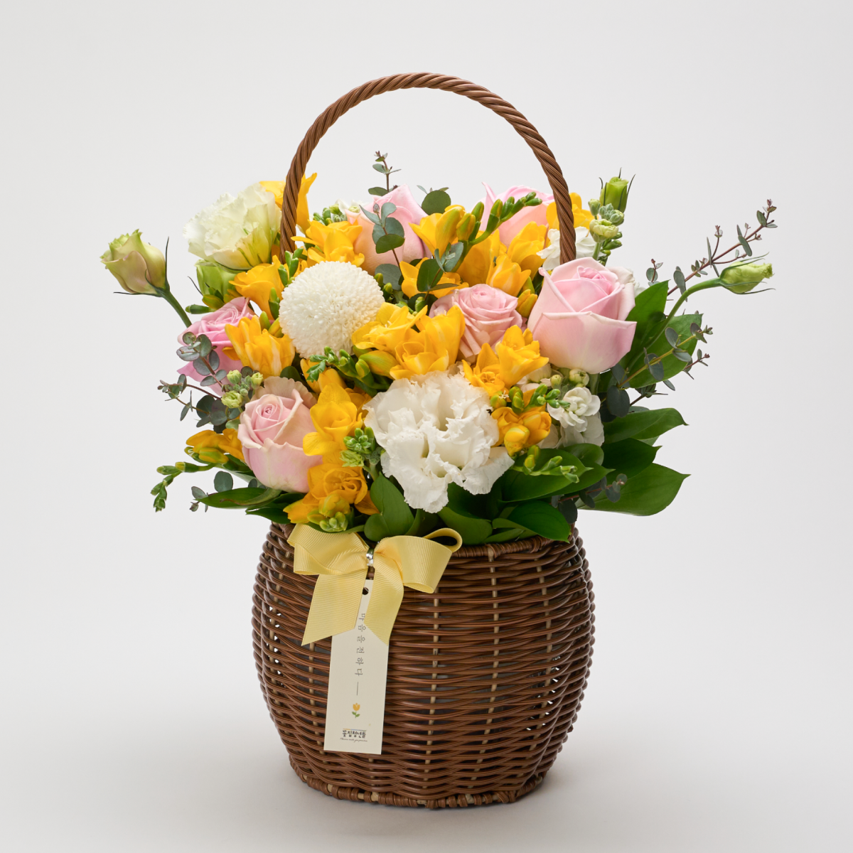 향긋한 봄을 알리는 후리지아와 화사한 계절꽃을 곁들인 꽃바구니입니다.
