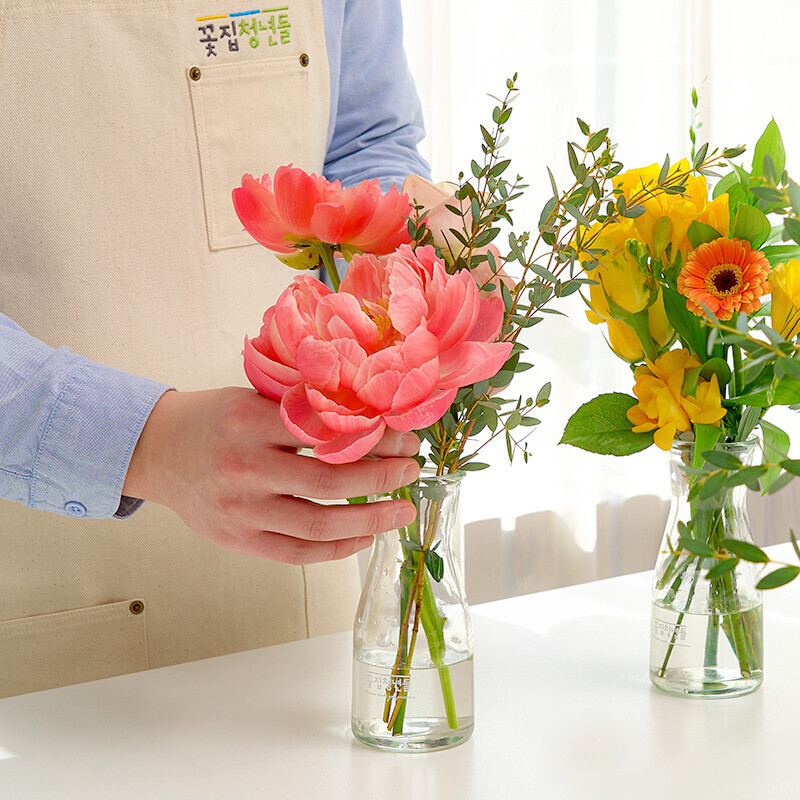꽃을 더 아름답게 보이도록 자체 디자인한 유리 화병입니다.