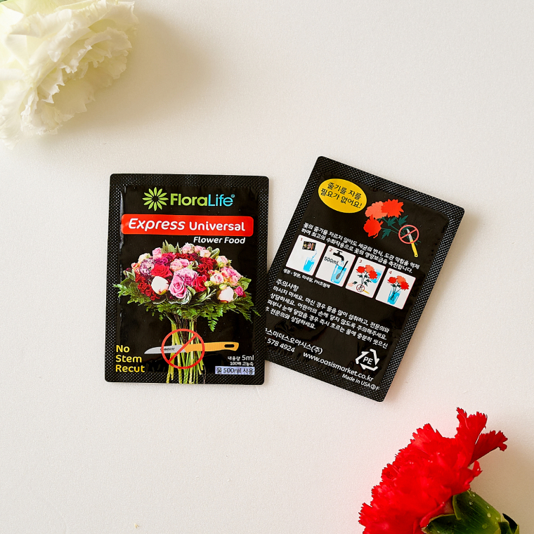 플라워푸드는 화병 내 세균 번식을 막고 영양분을 공급해 꽃을 싱싱하게 유지해 줍니다.