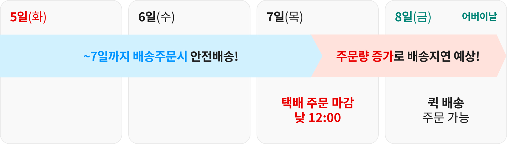 - 어버이날 당일(8일)에는 퀵 배송 주문량 증가로 배송 지연이 예상됩니다.